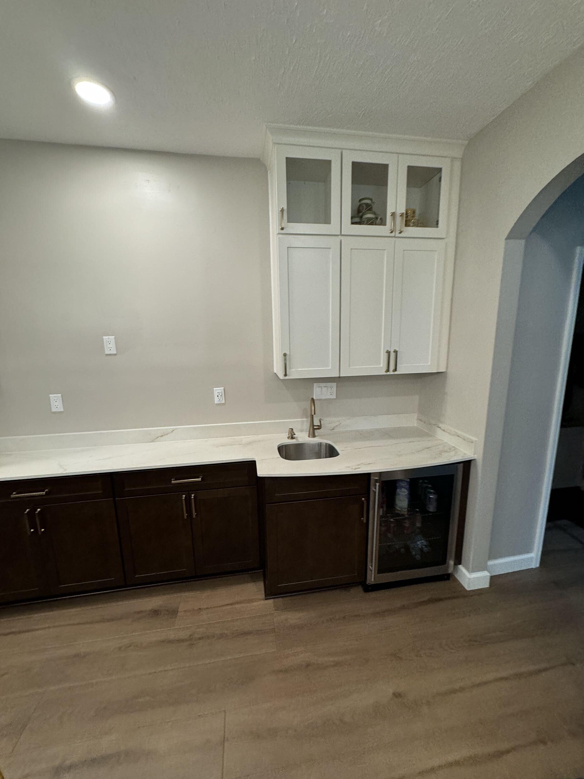 The mini fridge is integrated into the design with convenience in mind, ensuring that refreshments and essentials are always within easy reach. The sink has been thoughtfully positioned to combine style with practicality, while our custom cabinets and countertops are the standout features of this remodel. Each element was tailored to meet the client’s specific tastes and needs, providing both elegance and ample storage.
